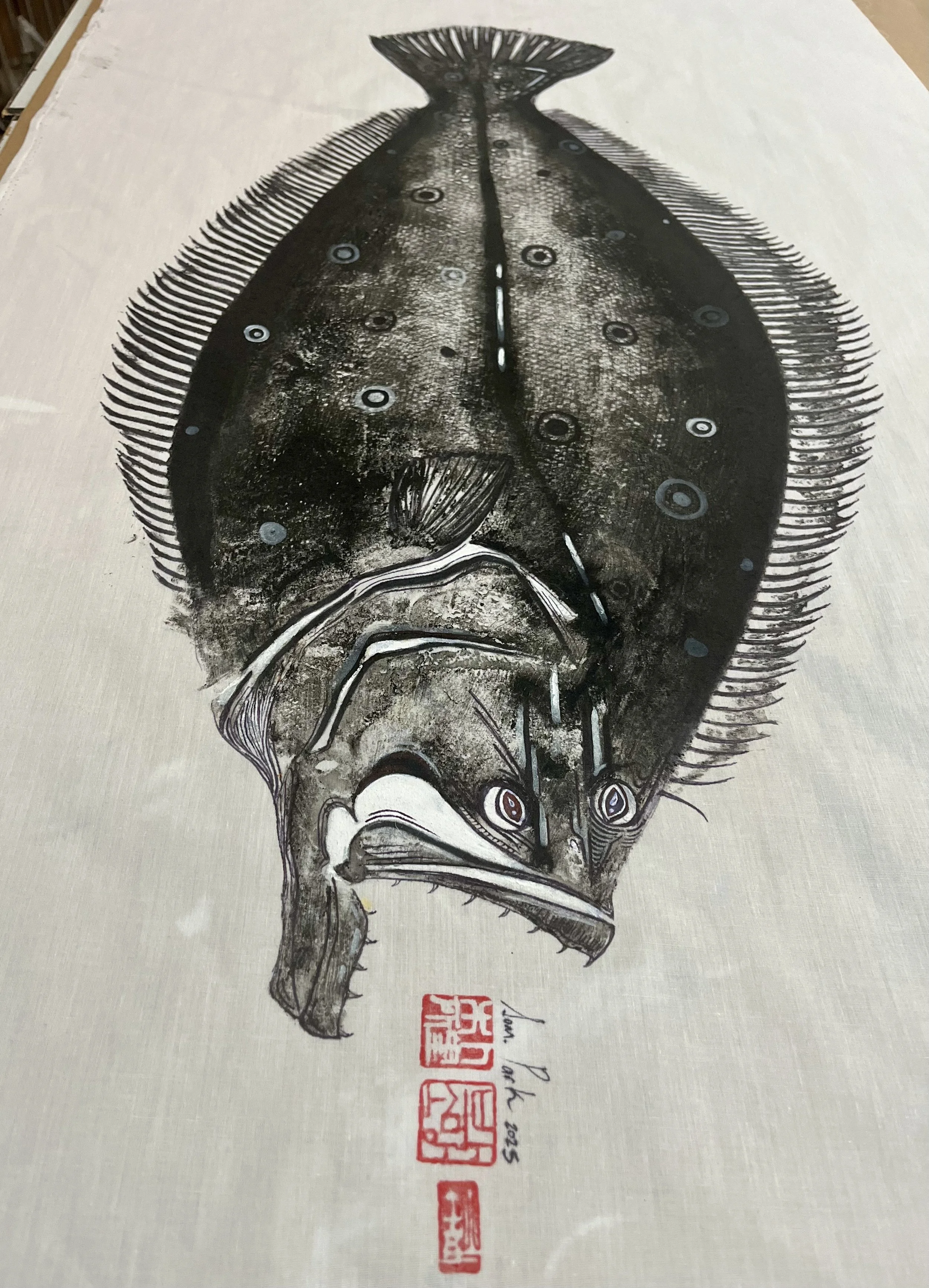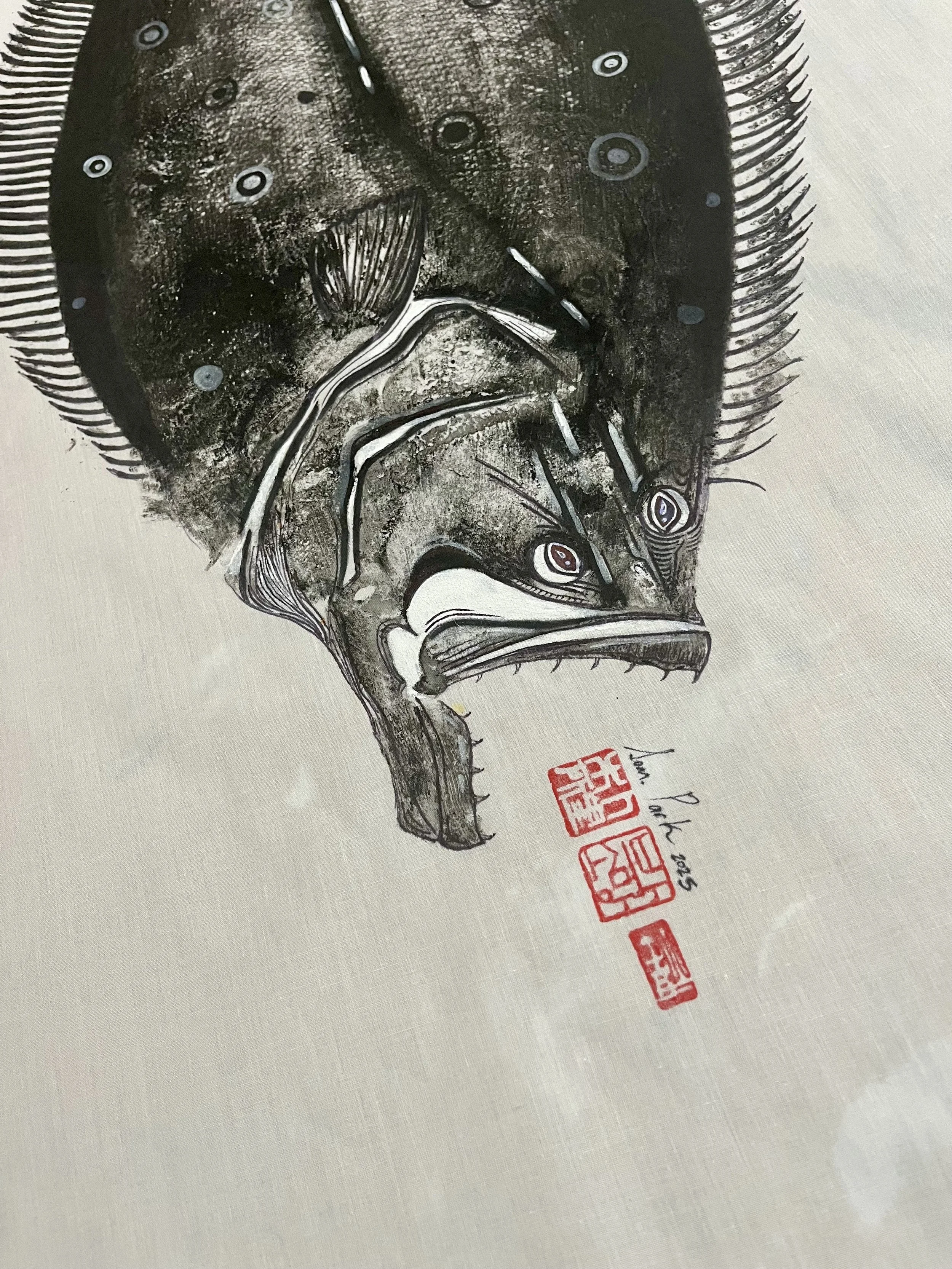 This piece measures 37 x 22 inches and has been created on canvas as an authentic imprint of the actual fish. Using traditional Japanese ink, the fish is carefully printed and then hand-rendered. Each work is finalized with signature stamps, personally carved from stone in South Korea.